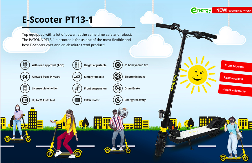 Seja rápido, sem stress, ecologicamente sustentável e em movimento com muita diversão. Para distâncias curtas/médias até 20Km : Universidade, escola, trabalho, compras - A Patona Scooter PT13-1 foi projetada para uso diário.